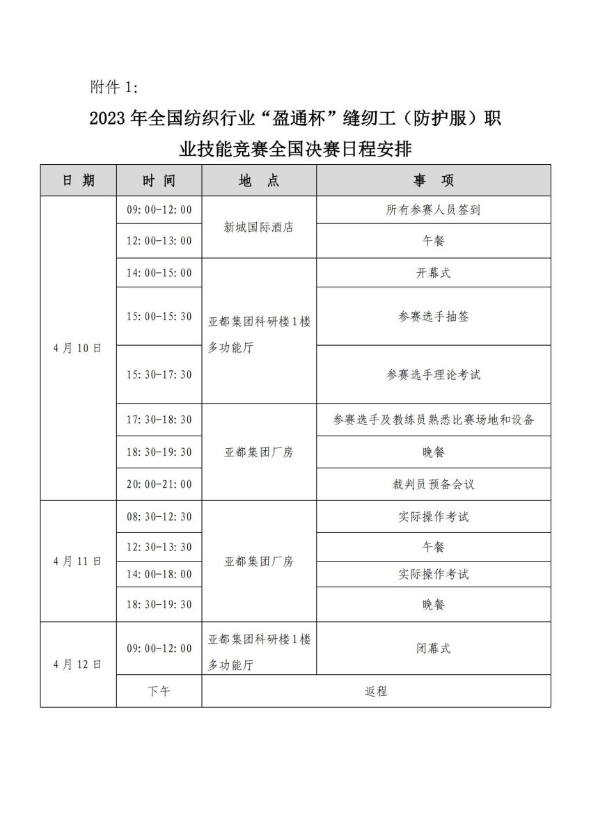 附件 1:2023年全国纺织行业“盈通杯”缝纫工(防护服)职业技能竞赛全国决赛日程安排