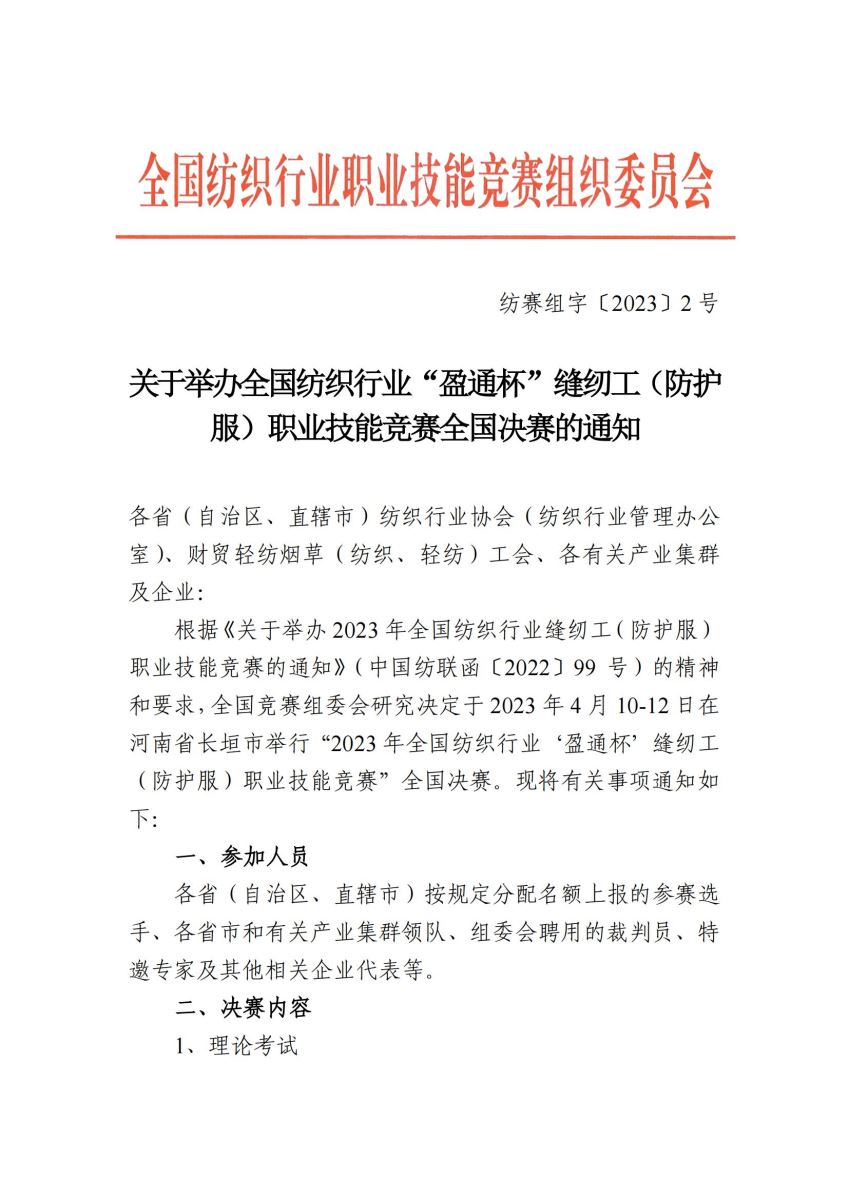 关于举办全国纺织行业“盈通杯”缝纫工(防护 服)职业技能竞赛全国决赛的通知