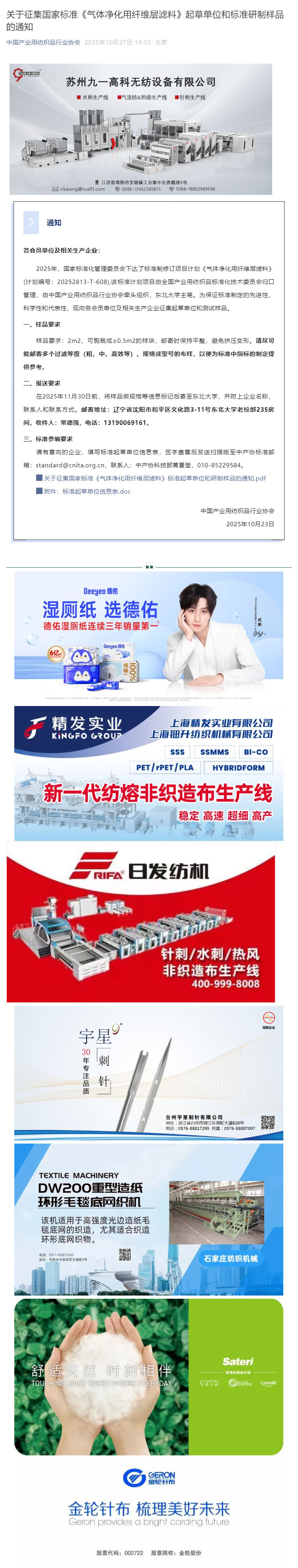 关于征集2026年度产业用纺织品与非织造布领域标准化需求的通知
